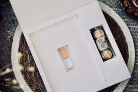 Case Ferrero pendrive e fotos 10x15, 13x18 e 15x21, para até 50 fotos, com espaço para Ferrero Rocher tampa personalizada com a sua logo.